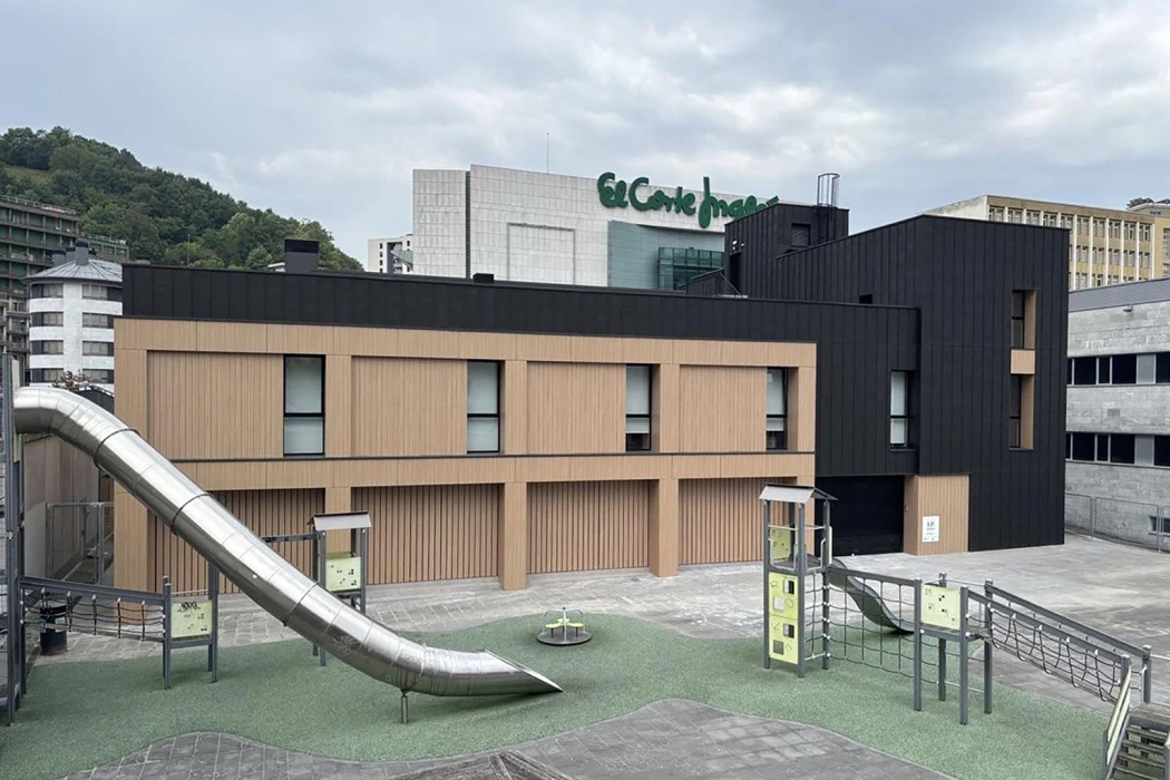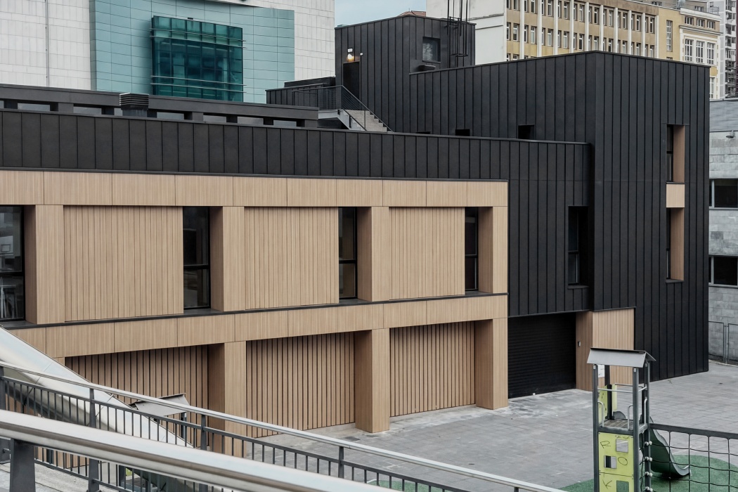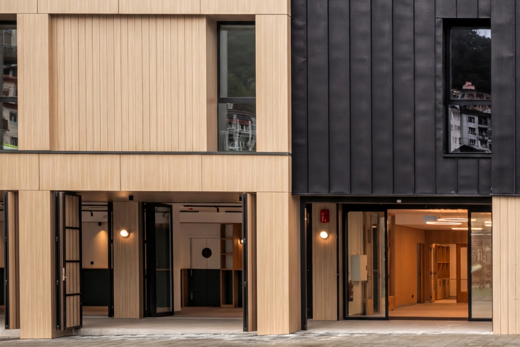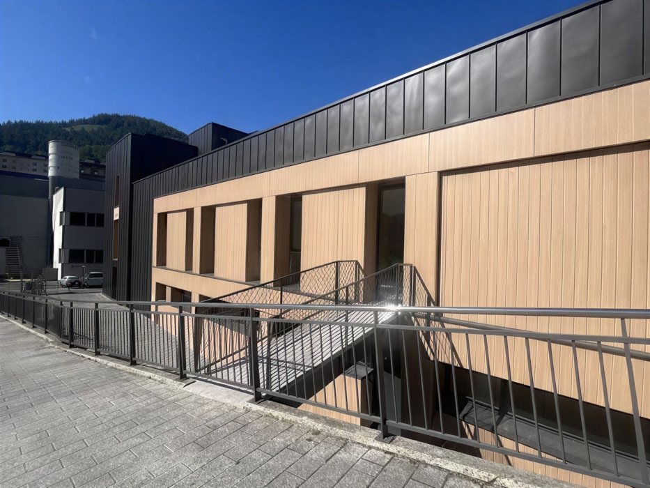 La envolvente del edificio se resuelve con fachada ventilada Fundermax acabado madera 0923 NT. En la fachada se intercambian zonas con placas lisas con otras en las que se ha realizado un falso ranurado vertical para conseguir efecto lama.